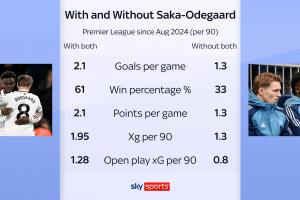天空体育数据统计显示,自2024年8月以来,当萨卡和厄德高同时出战时,阿森纳英超场均打进2.1球、胜率61%、场均2.1分、预期进球值1.95、运动战预期进球值1.28。