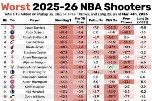 衡量参数(最后四列)依次为急停三分、接球就投三分、罚球和长两分总评分