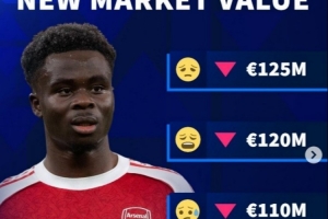 萨卡本赛季的表现不及预期,在26次英超出场只有6球3助,目前身价1.3亿欧。德转给出的下次身价选项最高为1.25亿欧,最低只有1亿欧。